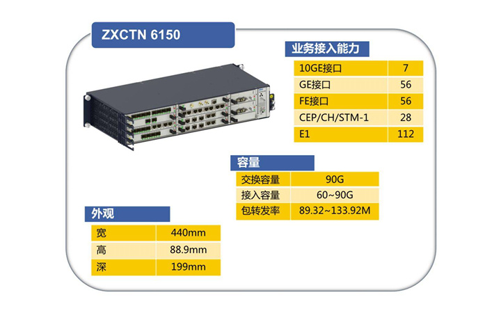 ZXCTN 6150(中興6150)最多提供9路10GE高速接口,56路GE(光/電)接口,支持10GE、GE、FE、STM-1、E1等類型接口。雙主控時(shí)支持6個(gè)業(yè)務(wù)處理槽位,單主控應(yīng)用最大支持7個(gè)業(yè)務(wù)槽位,定位于大容量接入,2U高,199深,安裝于19寸標(biāo)準(zhǔn)機(jī)柜。